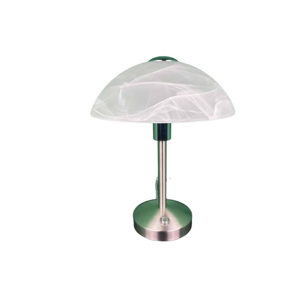 Lampa nocna z unikatowym, szklanym kloszem. Lampa ma metalową, satynową podstawę w kolorze srebrnym, która nadaje jej nowoczesny i elegancki wygląd. Idealna jako oświetlenie przy łóżku lub na szafce nocnej.
